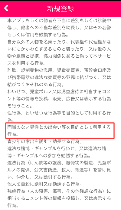 最初に同意させてくる利用規約では「面識のない異性との出会いを求める行為そのものが禁止事項に設定されている」事実があります。
